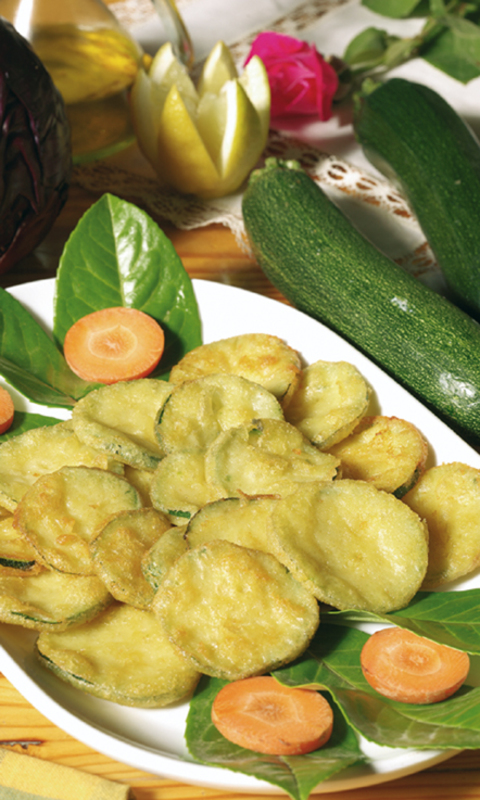 Rodajas de calabacin 42%, rebozadas y prefritas.