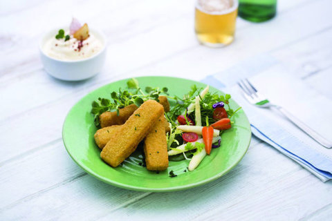 Trozo de merluza empanado en forma de varita precocinado y ultracongelado